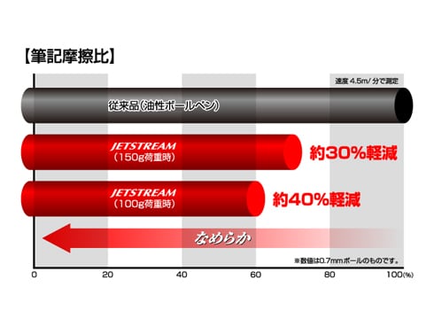 ※三菱鉛筆株式会社試験による筆記摩耗比 三菱鉛筆株式会社従来品(油性ボールペン)の各荷重における筆記摩擦係数を100%とした場合の『JETSTREAM』の筆記摩擦比。速度4.5m/分で測定。