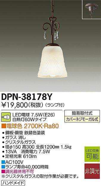 DAIKO ダイコー 大光電機 LEDペンダント 8.8W 非調光 電球色 DPN-38178Y の商品スペック