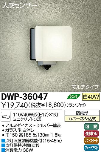 DAIKO ダイコー 大光電機 人感センサー付白熱灯ブラケット 40W形 マルチタイプ DWP-36047 の商品スペック