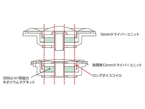 16mmドライバーユニットと同じサイズの300kJ/m3高磁力ネオジウムマグネットと、従来のボイスコイルよりも長く、マグネットとの接地を安定させるロングボイスコイルを採用。