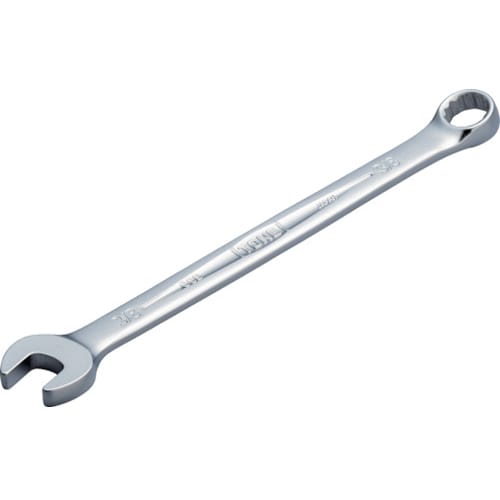 スパナのスピードとめがねレンチの強さを兼ね備えています。仮締めをスパナ側で、本締めはめがね側で行える1丁2役の機能工具です。めがね部の柄の曲がり角度15°です。