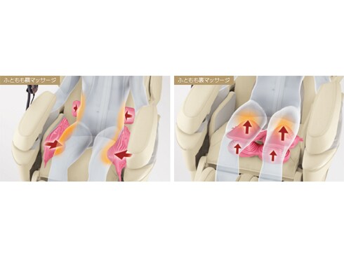 ふともも横と脚・足裏をエアーバッグでギュッと固定し、脚のせ台を上下させてストレッチ。モミメカも連動し、背中をググッと押し上げます。