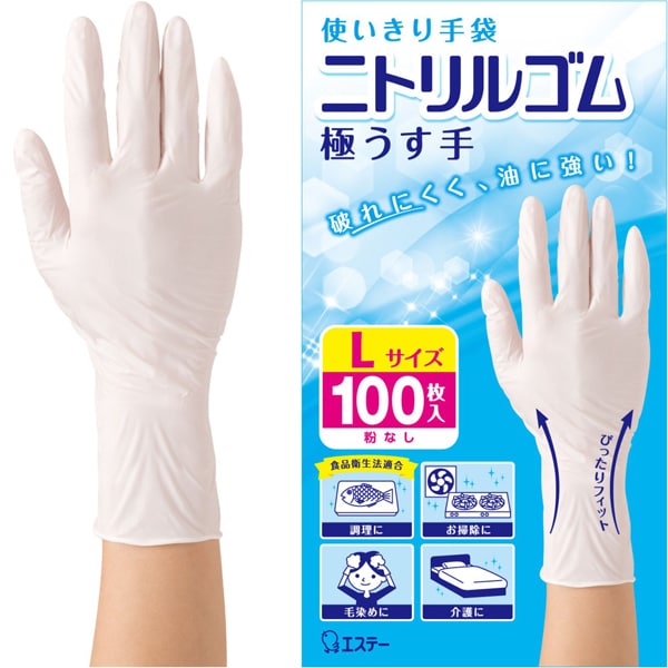 エステー 使いきり手袋 ニトリルゴム 極うす手 Lサイズ ホワイト 100枚 食品衛生法適合 粉なし パウダーフリー 左右両用タイプ 調理 掃除 毛染め 介護 の商品スペック