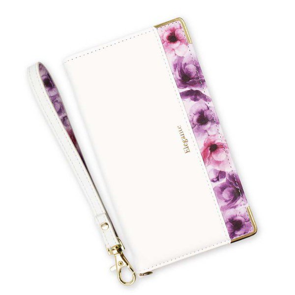 Eleganteシリーズの手帳型ケースです。咲き誇るフラワーと落ち着きのある優しいカラーリングが、オトナ可愛い。ケースを開く度フラワーが広がります。ケースの角にはゴールドパーツを使用することでより上品に。ストラップの内側にもさりげなく覗く花柄がおしゃれです。アーティフィシャルレザーを使用し、耐久性や手触りにもこだわりました。