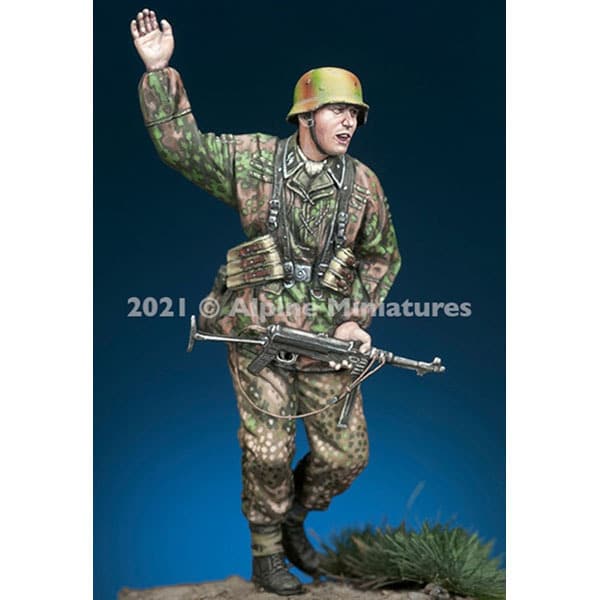 • ノルマンディー戦以降の大戦後期に支給された野戦服に身を包んだ武装SS師団所属の擲弾兵下士官を再現したフィギュアです。下士官が愛用したMP40短機関銃を構えつつ配下の部下に突撃か射線移動を指揮する姿を再現しています。大戦物のドイツ物を作らせたら間違い無しと言える高品質フィギュアを輩出するアルパインらしい素晴らしいモデルです。ヘルメットを被ったスペアヘッドはカバー有りと無しのどちらかを選択できるよう各1個づつ付属します。高品質レジン製 スペアヘッド2個入。(未組立未塗装)