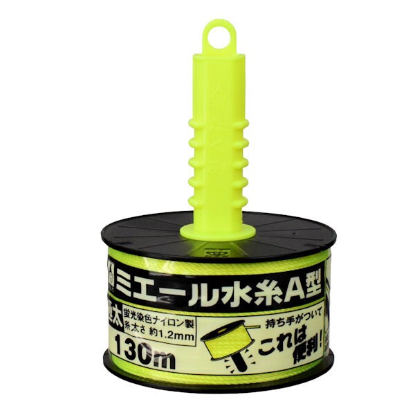 ミエール水糸にハンドルが付いて握りやすくなりました。視認性の高い蛍光5色展開です。長時間垂れにくい水糸専用ナイロンを使用しています。水につよいプラスチックリール。蛍光染色ナイロン100%。