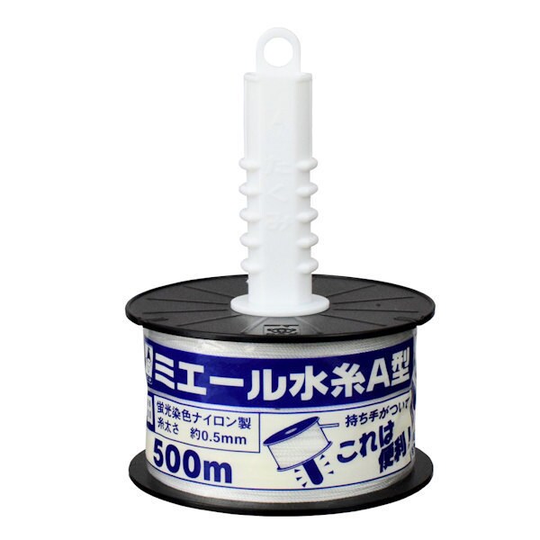 ミエール水糸にハンドルが付いて握りやすくなりました。視認性の高い蛍光5色展開です。長時間垂れにくい水糸専用ナイロンを使用しています。水につよいプラスチックリール。蛍光染色ナイロン100%。