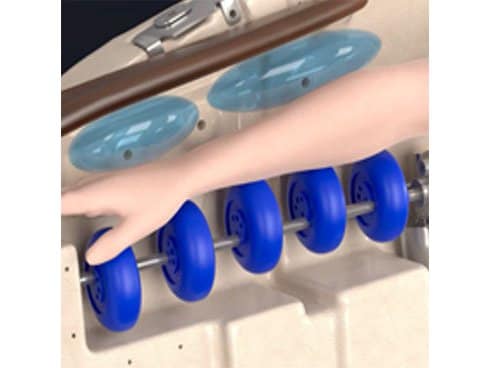 腕・脹脛・足裏に対してエアーによる圧迫に加えローラーを組み合わせることにより血行促進だけでなく筋肉のコリをほぐすことで、疲れを緩解させる独自の機構を開発しました。