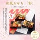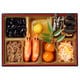 味付け数の子2個、花餅手まり1個、いか黄金25g、市松蒲鉾2枚、伊達巻2個、宮崎県産豚 牛蒡巻き2個、笹大福3個、椿団子1個、鹿児島産天然ぶり照り焼き2個、割烹ごぼう20g