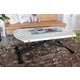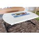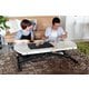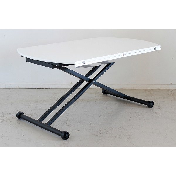 この昇降テーブルは、折りたたみ式の天板で、両側を開くことで簡単に調整できるため、活用の幅が広がります。両側の天板は折り畳む事ができるので、横に広く使いたい時には両側を折り、プライベートで使うのにぴったりな形状に。