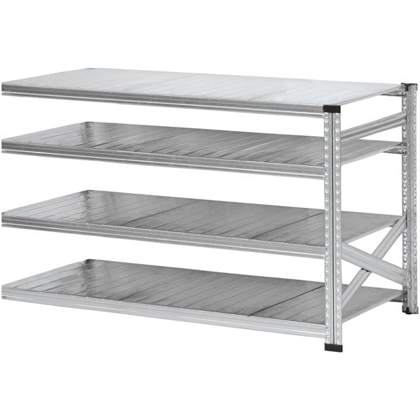 亜鉛メッキ加工された頑丈なスチール製に独特のリブ構造が採用されており、1段あたりの耐荷重は100kgとなります。重量のある物も確実に支え、安全に収納することができます。1つ1つのパーツが軽量な為、女性でも簡単に組立ができます。