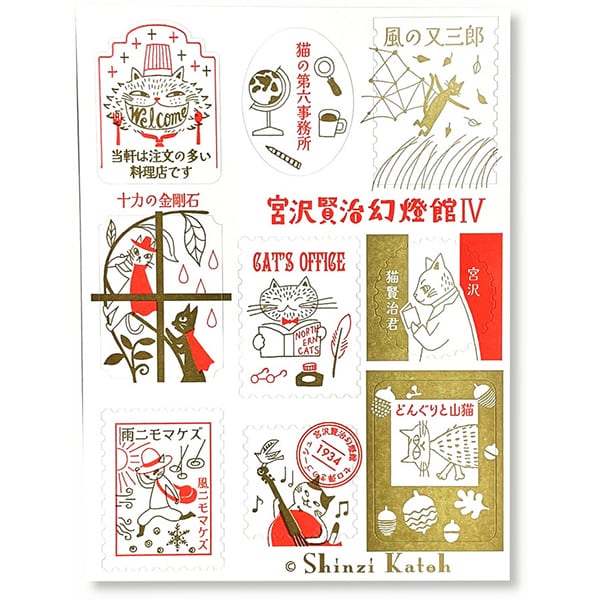 宮沢賢治の様々な作品から切り取られた、物語のワンシーンや物語を象徴するモチーフ描いた、宮沢賢治の作品世界旅するようなデザインのシールです。レトロな雰囲気のイラストを切手やアンティークフレームのような型に切り抜き、物語の世界観より魅力的に表現しています。