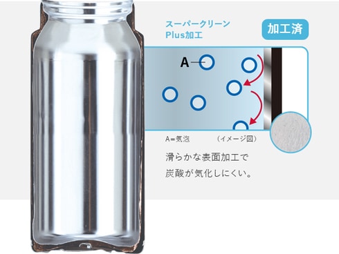 特徴的な光沢感がある、なめらかな表面加工。汚れやにおいが付きにくいだけでなく炭酸ガスの気化が少なくシュワシュワとした爽快感を長時間キープできます