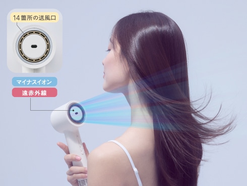中央から風が出ない設計で、毛束を包みこむように流れる風を実現。14か所の穴からシャワーのような心地よい風を送り出し、毛先まで素早く熱を届けます。さらに静電気を抑制するマイナスイオンの力と髪を芯から温める遠赤外線の力で、髪と地肌をしっとり素早く乾かします。
