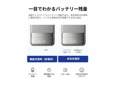 液晶ディスプレイでバッテリー残量や出力、再充電状況を簡単に確認。いつでも使用状況が把握できる安心設計。