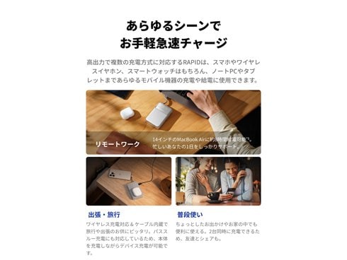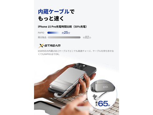 65W対応USB-Cケーブルを内蔵しているため、ケーブルを持ち歩かなくてもモバイル機器をどこでも急速充電。ノートPCやタブレットもしっかり充電できるため、ビジネスシーンからちょっとしたお出かけまで。