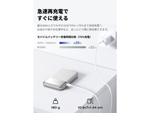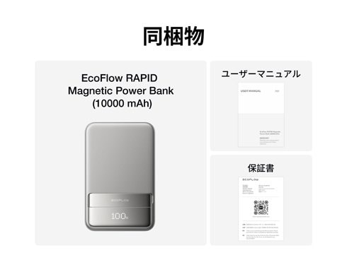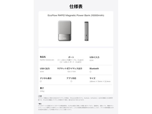 エコフロー EcoFlow RAPID Magnetic Power Bank 10000mAh マグネット式 モバイルバッテリー Qi2 65W対応USB-Cケーブル内蔵 液晶ディスプレイ搭載 シルバー EF-RAPID10000-JP の商品スペック