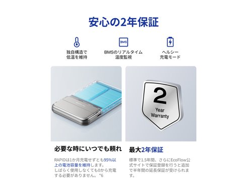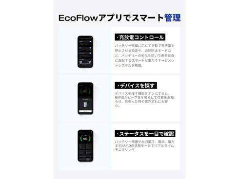 バッテリーの劣化を防ぐ自動充放電制御や本体を探す機能、詳細な使用状況のモニタリングまで、スマホアプリで簡単 & スマート管理。