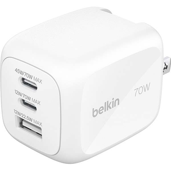 Belkin ベルキン USB急速充電器 70W USB-C×2/USB-A×1 GaNチップセット内蔵 プラグ交換式 WCH018qcWH の 商品概要
