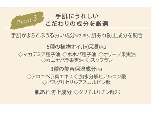 手肌にすばやくなじみ、しっとりしてベタつかない。角質層まで浸透し、みずみずしい手肌へ。