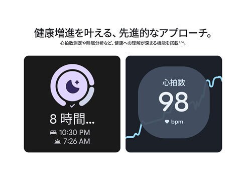 Google Pixel Watch 4 では、高精度の心拍数測定、総合的なアプローチによるストレス管理、睡眠データの記録、眠りの質の改善に役立つ分析といった機能に加え、血中酸素ウェルネスや HRV などの主要な健康指標を活用して、ご自身の健康への理解を深めることができます4、6、7、8。