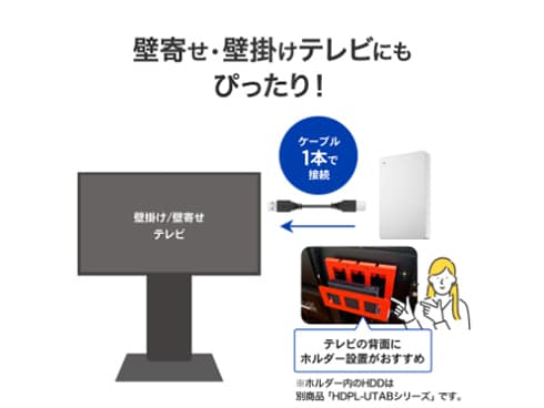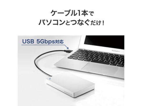 USB 5Gbps(USB 3.2 Gen1)対応のポータブルハードディスクです。テレビ録画、パソコンのデータ保存にご使用いただけます。テレビやパソコンとケーブル1本つなぐだけで設置完了。電源不要なため、コンセントの場所や数を気にせずに設置できます。