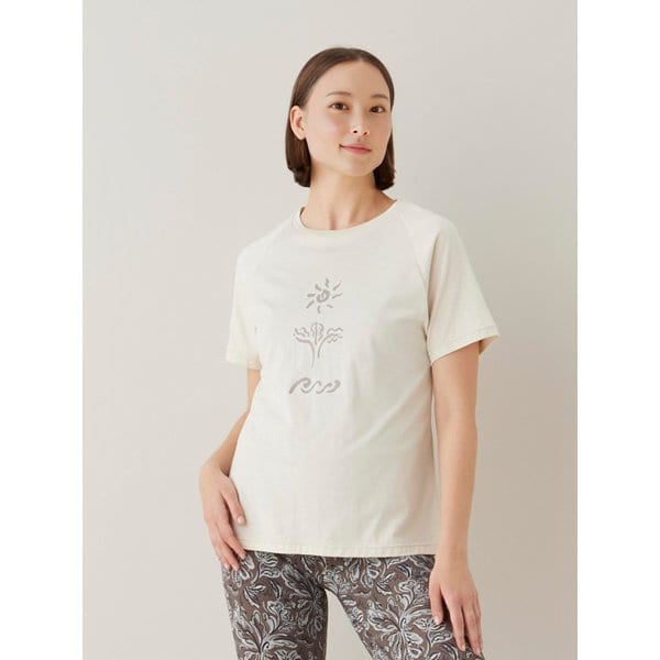 ラストレーターのRemi AbiruとのコラボレーションTシャツ。suriaとヨガのイメージをもとに、太陽・木・波をモチーフに描き下ろしたコラボTシャツ。後ろには手描きのブランドロゴもプリントされています。