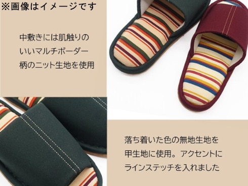 マルチボーダーとツイル生地の組み合わせのカジュアルなスリッパです。