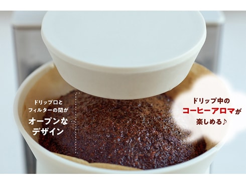 [レインドリップコーヒーメーカー]は、ハンドドリップの再現を目指し、[ドリップ口]から雨のように降りそそいで抽出する仕組み。[フィルターホルダー]がオープンなデザインなので、ドリップ中はコーヒーのアロマに癒されます。