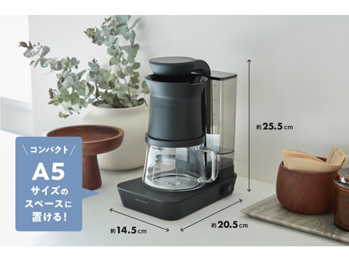 ウォータータンクが薄く正面から見えにくい、軽やかなデザイン。幅は15cm弱。コンパクトサイズで、キッチンやテーブルに置いても圧迫感がありません。フィルターホルダーがオープンなデザインなので、ドリップ中はコーヒーのアロマに癒されます。