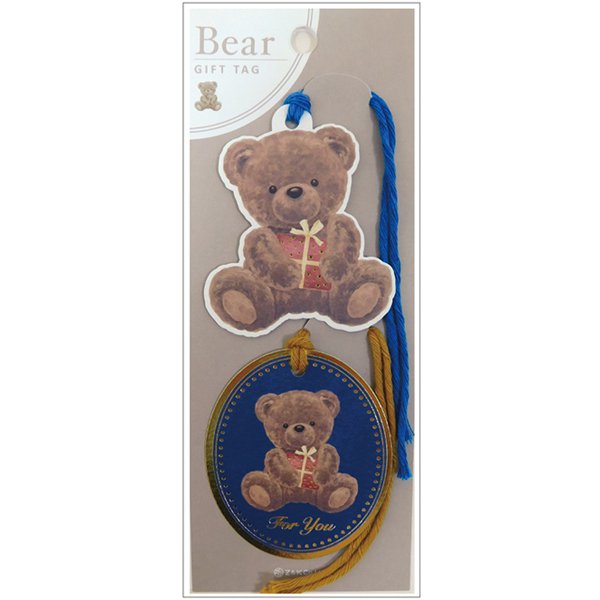 型抜きされたくまとオーバル型のくま、2種類のタグです。約13CMの紐が付いているのでプレゼントのアクセントとして使用できます。裏にはメッセージが書けます。
