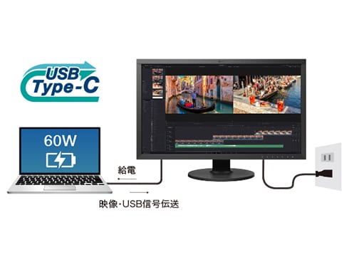 USB Type-Cケーブル1本の接続で、ノートPCに最大60W給電します。