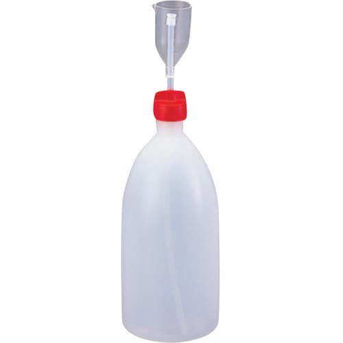 ワンタッチで秤量・分注できるボトルタイプの分注器です。分注パイプに目盛が付いており、カップを上下させて容量を設定します。