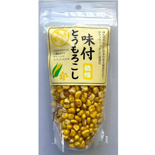 ほんのりとした甘味のあるしょう油仕立て。サクッサクッとした食感の味付乾燥とうもろこしです。そのままおやつにお召し上がりいただけます。