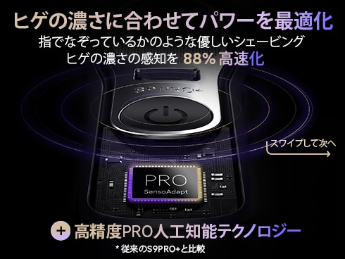 高精度スマートセンサーを搭載したPRO人工知能テクノロジーはヒゲの密度を約2倍の速さ*(前モデルのS9 PRO+と比較して)でスキャンし、パワーを最適化。