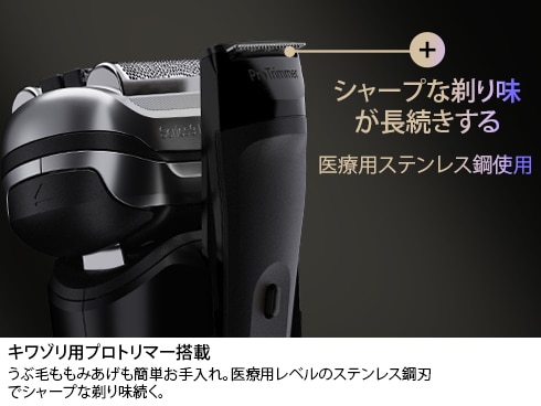 前後に40°動く密着コンパクトヘッドが、あご下などの剃りにくい部位でも驚くほどの深剃りを実現します。プロトリマー搭載で、もみあげや産毛も最高の精度で剃れます。