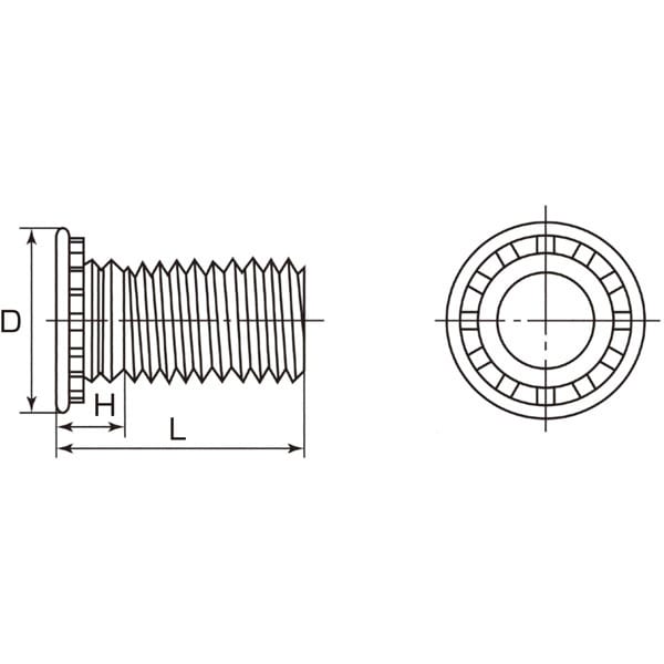 圧入タイプのスタッドです。簡単な圧入で母材表面と面一の仕上げが可能です。容易に垂直度の高いねじを立てることが可能です。薄板への圧入に。SUS304材には圧入できません。