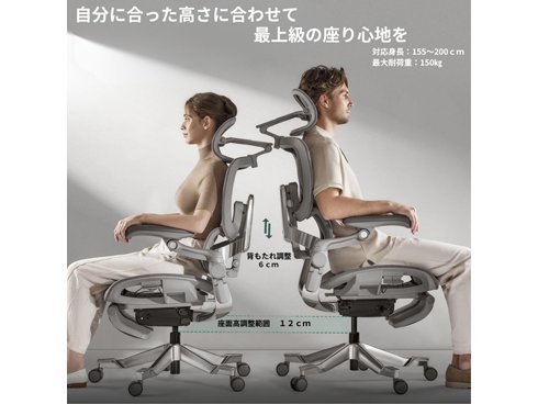 ガスシリンダーの長さにこだわり、座面の高さを12cmの範囲で調整できます。そのため、想定対象身長が155cm~200cmと広域で、様々な方に有意義にお使いいただけます。また、背もたれも細やかな高さ調整が可能!