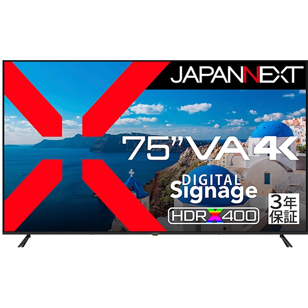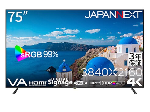 JAPANNEXT ジャパンネクスト 液晶モニター/75型/4K(3840×2160)/VAパネル/半光沢/HDR400相当/HDMI×3 ビデオ音声入力×1 コンポーネント入力×1/スピーカー内蔵/USBメモリ再生/リモコン同梱/3年保証 JN-V750U-M-H3 の 商品概要