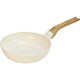 ホワイトカラーにウッド調のハンドルがキッチンを明るくオシャレに。有機フッ素加工物は一切使用していないセラミック加工なので環境に優しく安心安全。耐摩耗試験50万回クリア、耐久性が高くこびりつきにくい。内面フラットなのでお手入れ楽々。中火以下でご使用ください。