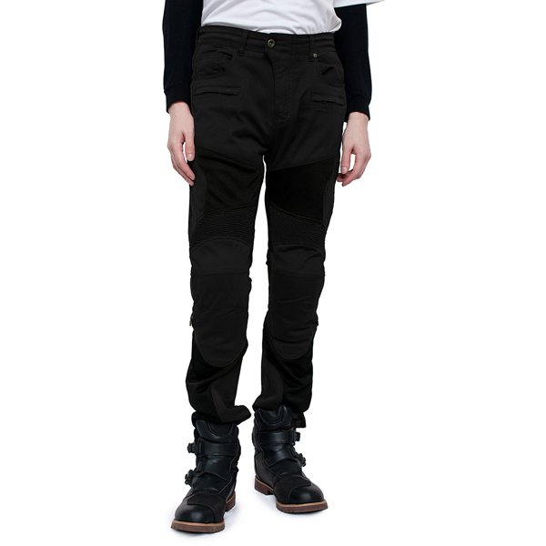 伸縮性のあるコットンとメッシュを組み合わせたメッシュパンツ。乗車姿勢が取りやすい3Dパターンを採用し、膝と腰には運動性を高めるシャーリングを配置。膝にはCE規格レベル2ソフトプロテクター、腰横にはウレタンパッドを標準装備