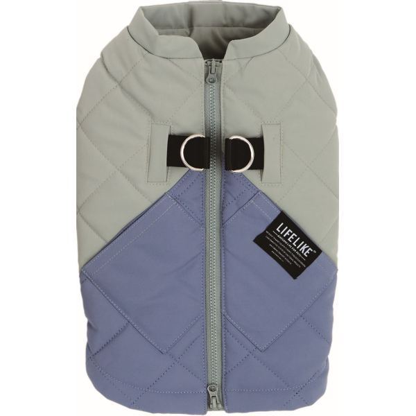 シックなバイカラーに大きめのダイヤ柄キルティングを合わせた、背開きタイプのお洋服です。シンプルで飽きのこないデザインは、飼い主さんのファッションとも相性抜群!