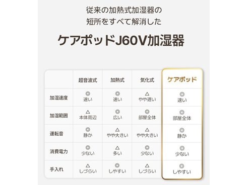 ケアポッド CAREPOD ハイブリッド式加湿器 CAREPOD CUBE PLUS(ケアポッド キューブプラス) 木造8.5畳/鉄筋14畳まで タンク4.2L 除菌 湿度調節 J60V の商品スペック