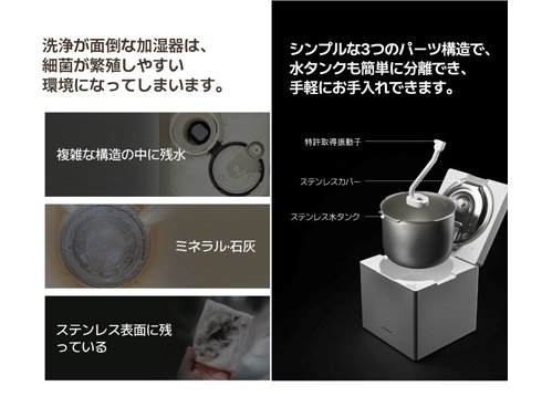 従来の加熱式加湿器で心配な火傷の危険、高い電気代、お手入れ時のタンクの汚れや洗浄の手間などのお悩みを解決した新しい低温加熱式製品です。