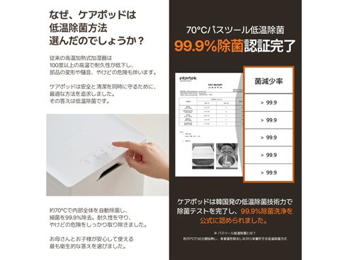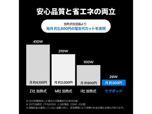 既存の高温式に100℃は高温により製品内部の損傷と高い電気代の負担がありますが、ケアポッドは安全な温度でこの欠点を解決しました。