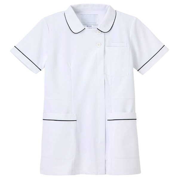 ウエストベルトが無いシンプルなシルエットのネイビーシリーズです。衿元は涼しく、下を向いてもファンデーションが付きにくくなっています。●左胸(PHSポケット付き)、両腰ポケット