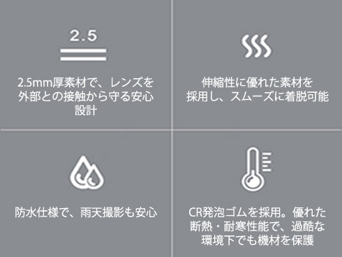 高い伸縮性を持つ素材を採用し、鏡筒にぴったりフィット。装着・取り外しが簡単で、手間を感じません。表面には防水加工を施しており、防塵・防滴性にも優れています。