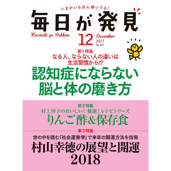 • 「認知症」になる人、ならない人の違いは生活習慣から!?認知症最新情報と予防法をお伝えします。アーユルヴェーダやリンパビクスなど食や運動、園芸での予防法もご紹介。大好評の村上祥子先生・レシピシリーズでは「りんご酢&保存食」。美容企画では「眉」の正しい作り方を特集。2018年の気になる運勢を解説する「村山幸徳の展望と開運」も必見です。