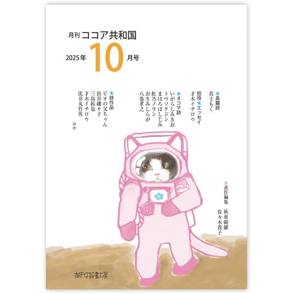 今月のゲストは、秋吉久美子、いがらしみきお、真土もく、才木イチロウ、トウソクジンの5名。投稿詩傑作集として53名、佳作集には87名の詩人が登場。毎号、投稿詩を中心に編集していく予定です。詩は楽しくて、深いものだと感じてもらえる編集に努めます。