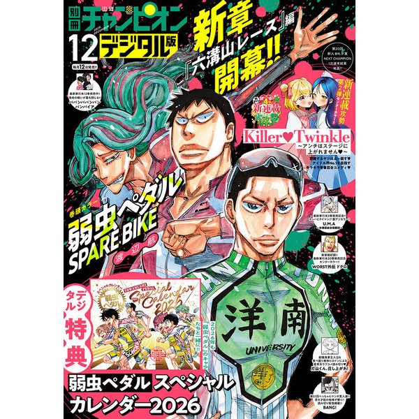 • ◎最新単行本15巻発売&新章開幕記念!! 表紙&巻頭カラー!! デジタル特典スペシャルカレンダーも!!【弱虫ペダル SPARE BIKE】◎アイドル界No.1を目指すキラキラ青春百合コメディ・新連載攻勢第2弾!! センターカラー!!【Killer・Twinkle ~アンチはステージに上がれません・~】◎最新単行本3巻発売記念!! みちのく熱狂UMAバトル!! 超絶興奮センターカラー!! 【U.M.A~未確認総合格闘技~】◎新章絶好調!! 最新単行本20巻発売記念センターカラー!!【WORST外伝 ドクロ】◎止まらない勢い!! 最新単行本12巻発売記念センターカラー!!【ババンババンバンバンパイア】◎新星作家が描く、食育ラブコメディ読み切り・【片山くん、召し上がれ!】◎第51回べっちゃんマンガ賞入選!! GEKIYABA読み切り緊急掲載!!【BANG!】※電子版につきましては本誌内のプレゼントの応募は出来ません。ご注意ください。
